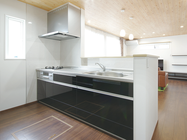 キャビネットのスペースをムダなく活かして、たっぷり収納できる引出し式のスライドストッカーを採用したプランです。シンクは大きな鍋も洗いやすいセンターポケット形状。水ハネ音が静かな静音設計。