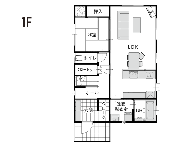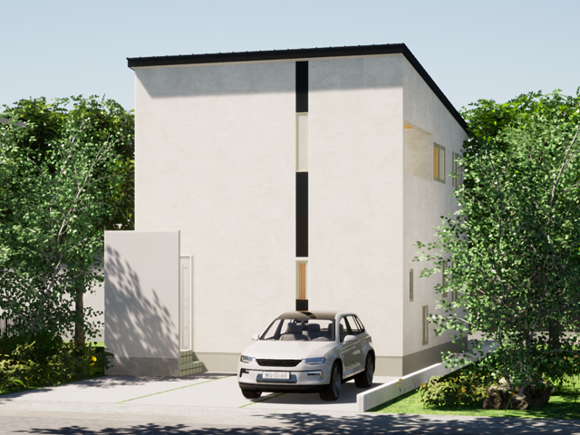 シンプルで洗練されたエクステリア、対面キッチンやくつろぎの和室が、二間続きになる広いLDK、そして2階バルコニーが印象的なプラン。